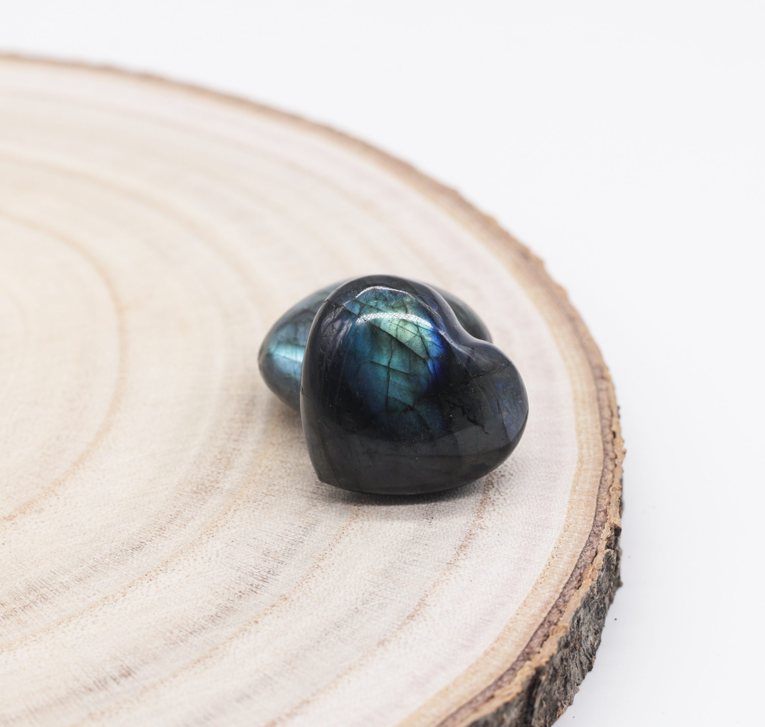 Couleur(s) : Bleu, vert et gris. Pour le “Coeur Labradorite”, la Labradorite est souvent dans les tons de vert, kaki avec des reflets dorés et bleu flash.