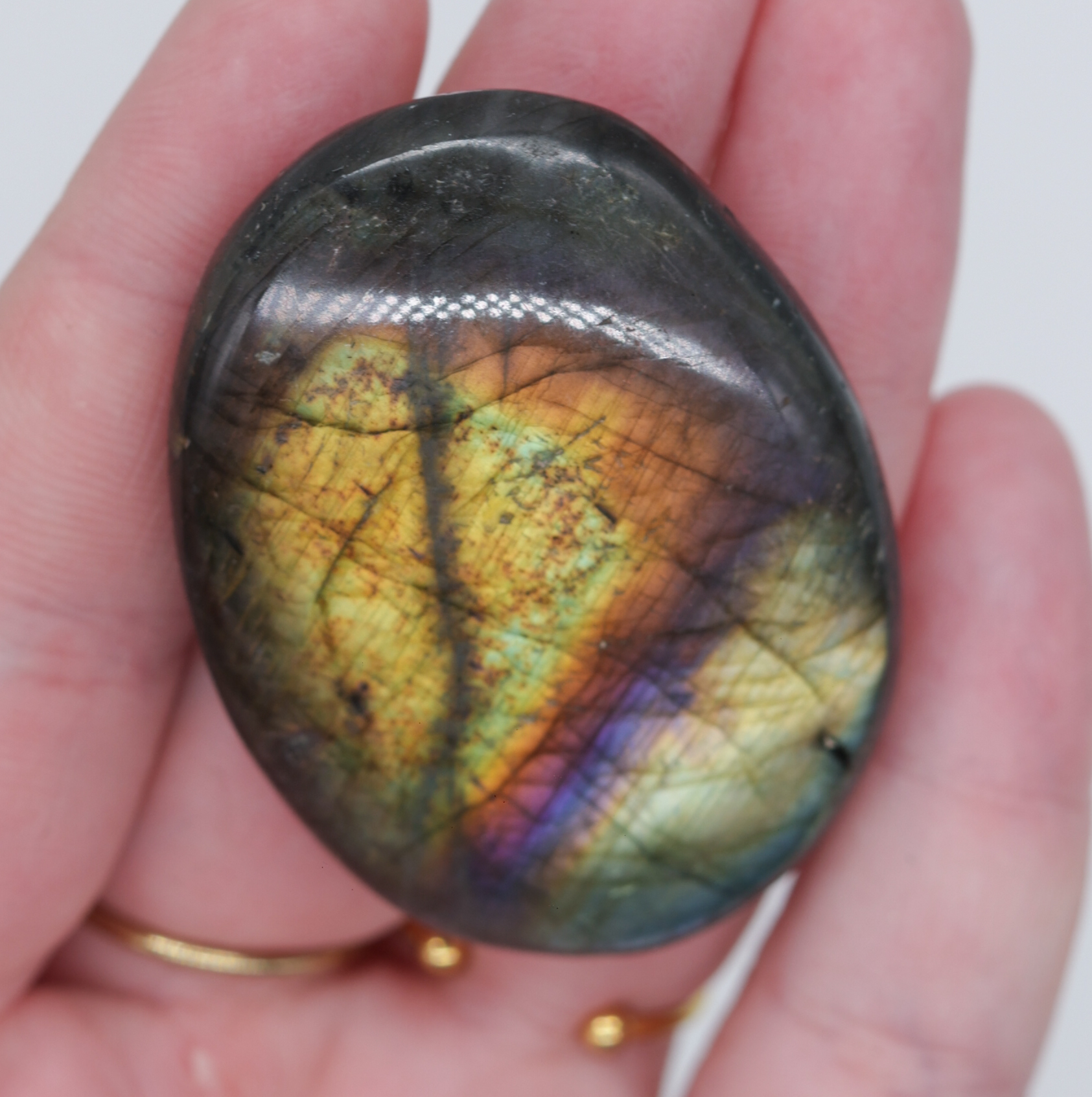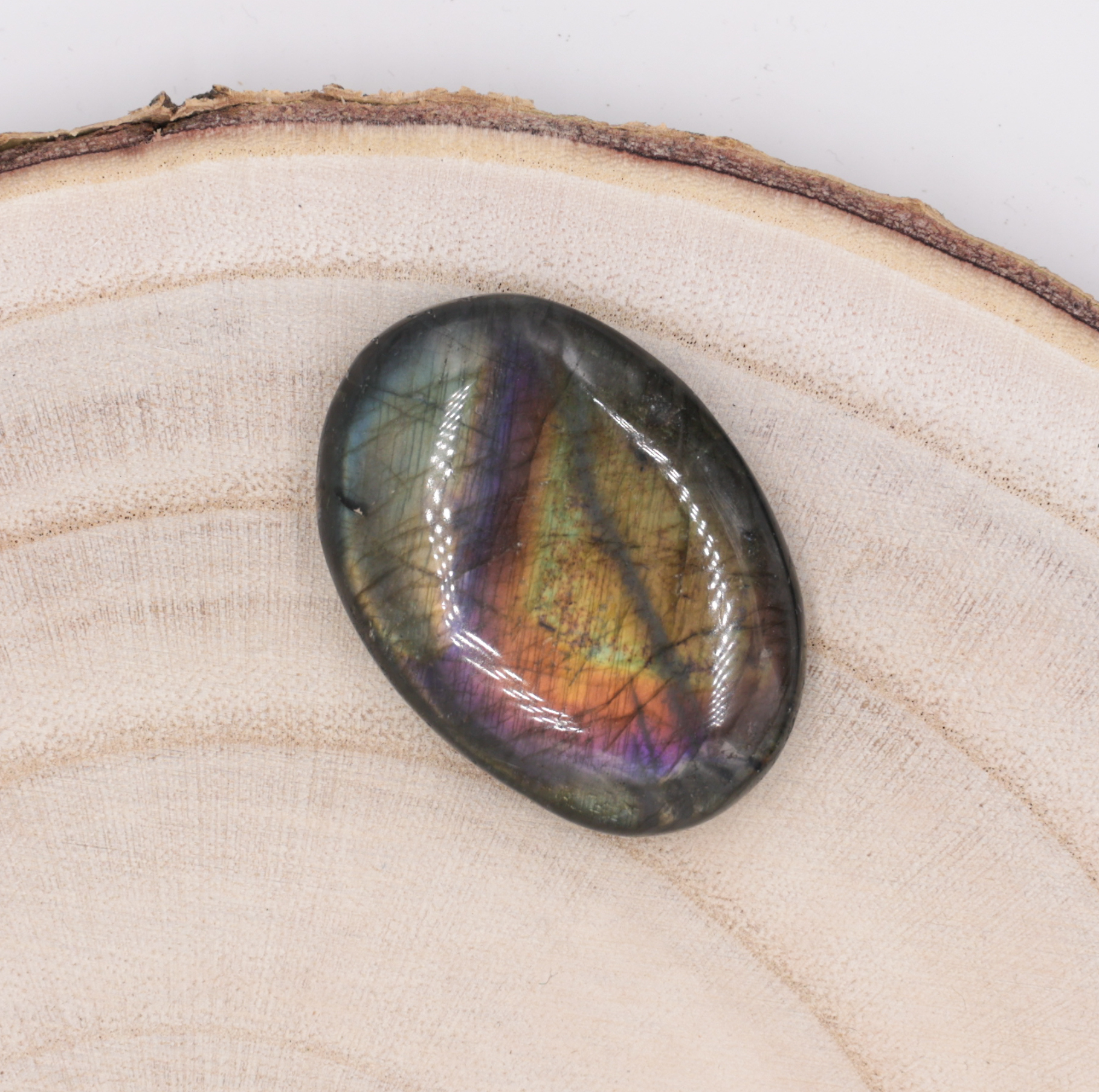 Couleur(s) : Bleu, vert et gris. Pour le “Galet Labradorite Arc-en-ciel”, la Labradorite est dans les tons de vert, kaki avec des reflets multicolores (doré, vert, rose, violet, orange)